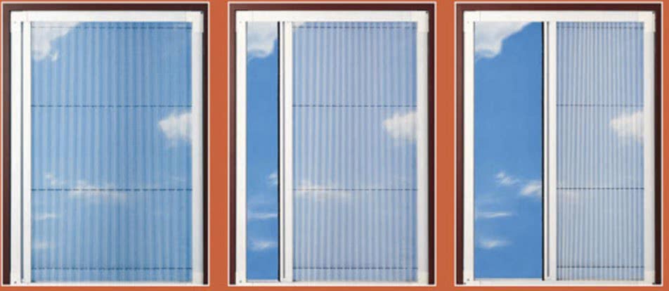 Это вертикальные или горизонтальные «складные» сетчатые жалюзи, позволяющие перекрыть проемы высотой до 3,5 метров и шириной до 5 метров. Поэтому это единственно подходящий для зимних садов, открытых террас, больших лоджий тип москитных сеток. Сетки-плиссе универсальны и могут открываться как вправо, так и влево, вертикально (идеально в мансардах) или встречно.