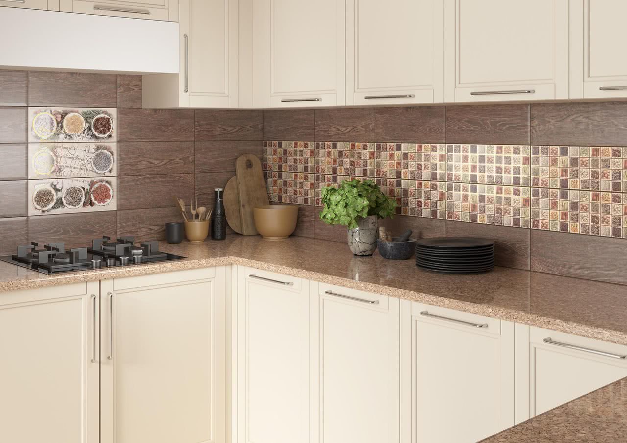 При оформлении кухни особое значение имеет не только форма, цвет, фактура, но и размер плитки. Он может быть разным – от мозаичных квадратиков 1х1 см до внушительных плит 60х60 см. Стены чаще всего облицовывают глазурованными квадратными элементами, которые зрительно расширяют пространство благодаря глянцевой поверхности, со стороной 15 см. Также распространены варианты с размерами 30х30 и 40х40 и 20х30, 30х40. Крупногабаритная плитка не лучший вариант для стен, поскольку монтировать ее довольно сложно.