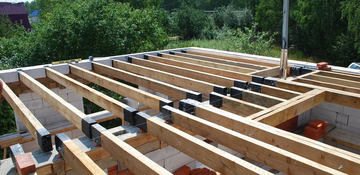 Как и в домах домах построенных из дерева, так и в домах из кирпича можно использовать деревянные перекрытия. Традиционно состоят они из толстых балок, с шагом 100-150 , однако, применяются тонкие элементы, но гораздо более густо расположенные (40 или 60 см), а с низу скрытые гипсо-картонными плитами.