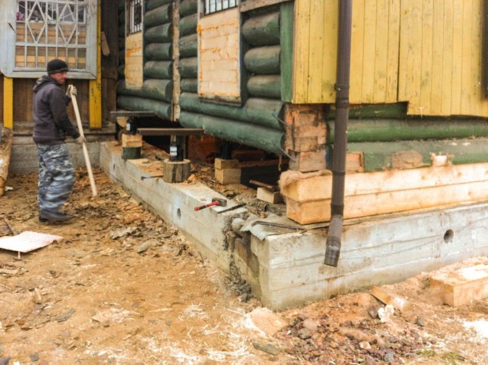 Важно! Подъем дома осуществляется в несколько этапов. На каждом из них сторону дома поднимают не более чем на 1,5 см., после чего его положение дополнительно фиксируется временными опорами-подставками из бруса, а сам дом проверяется на наличие сопутствующих повреждений
