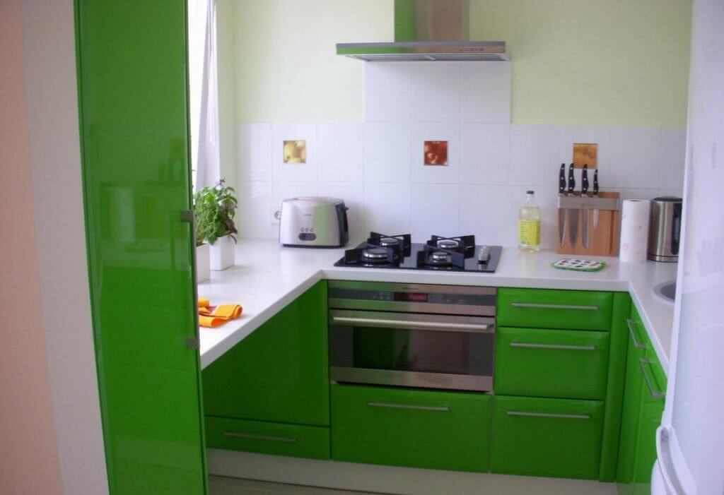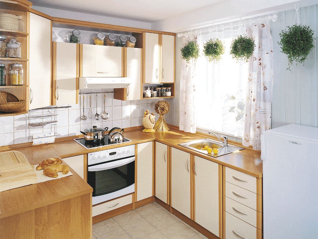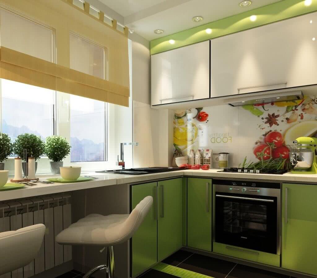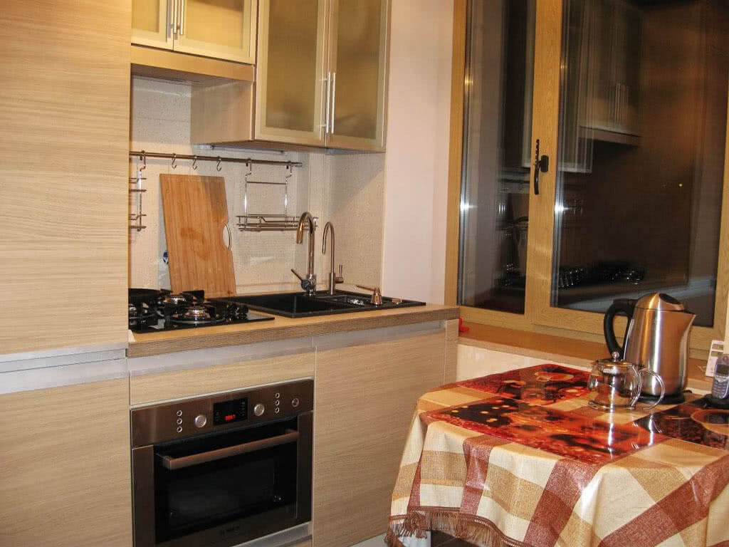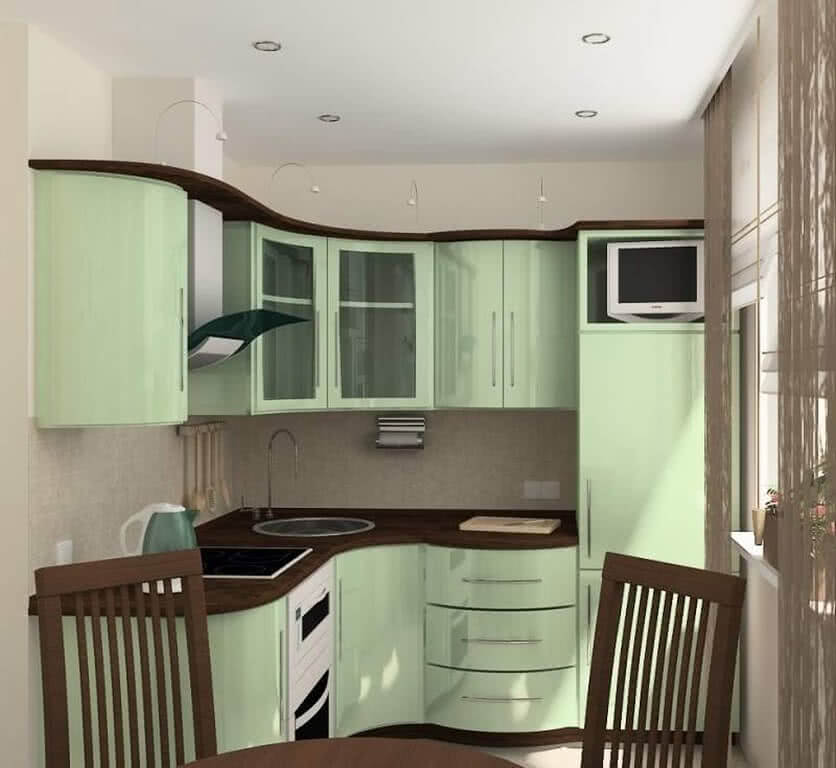 Рациональное использование квадратных метров маленькой кухни позволяет разместить весь необходимый для домашней работы набор предметов и устройств. Например, организация мойки на месте подоконника позволит прибавить к свободной площади почти половину квадратного метра. Можно также просто удлинить подоконник и превратить его в полукруглый стол. Острые углы в таких маленьких помещениях делать не следует, так как все обитатели квартиры постоянно будут на них натыкаться.