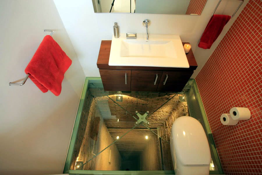 Если вам надоели стандартные решения, можно поискать идеи в интернете и создать необычный интерьер туалета в новостройке. Интересный вариант демонстрирует следующая фотография.