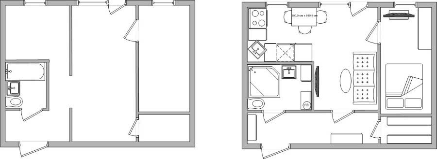Двухкомнатная хрущевка до и после перепланировки – расширен санузел, кухня объединена с гостиной, значительно увеличена площадь входной зоны