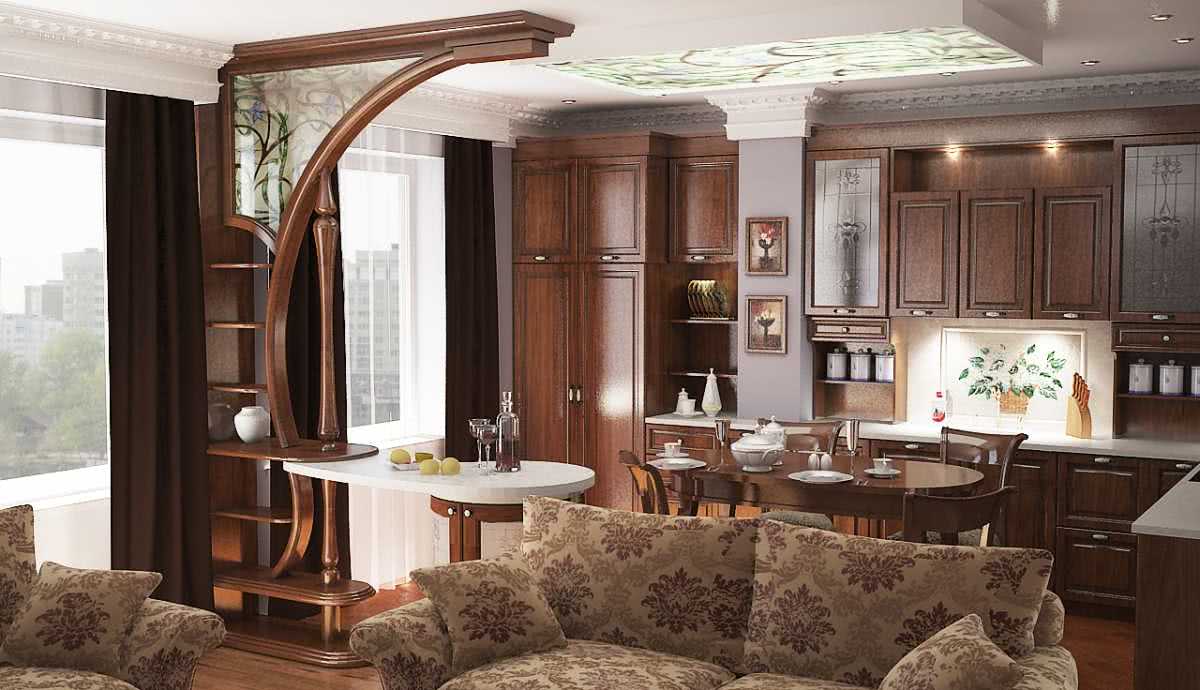 В некоторых случаях перегородки не разрушаются до конца, а лишь видоизменяются – трансформируются в арку, к примеру. Сооружения арочных конструкций часто требует дизайн кухни-гостиной – арка в помещениях этого типа служит зонирующим элементом.