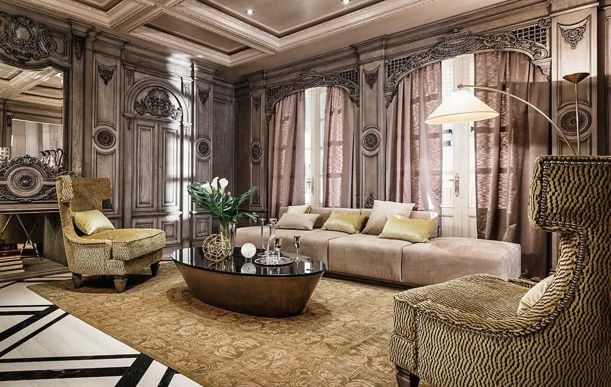 Шикарный интерьер зала с мраморной плиткой в качестве напольного покрытия