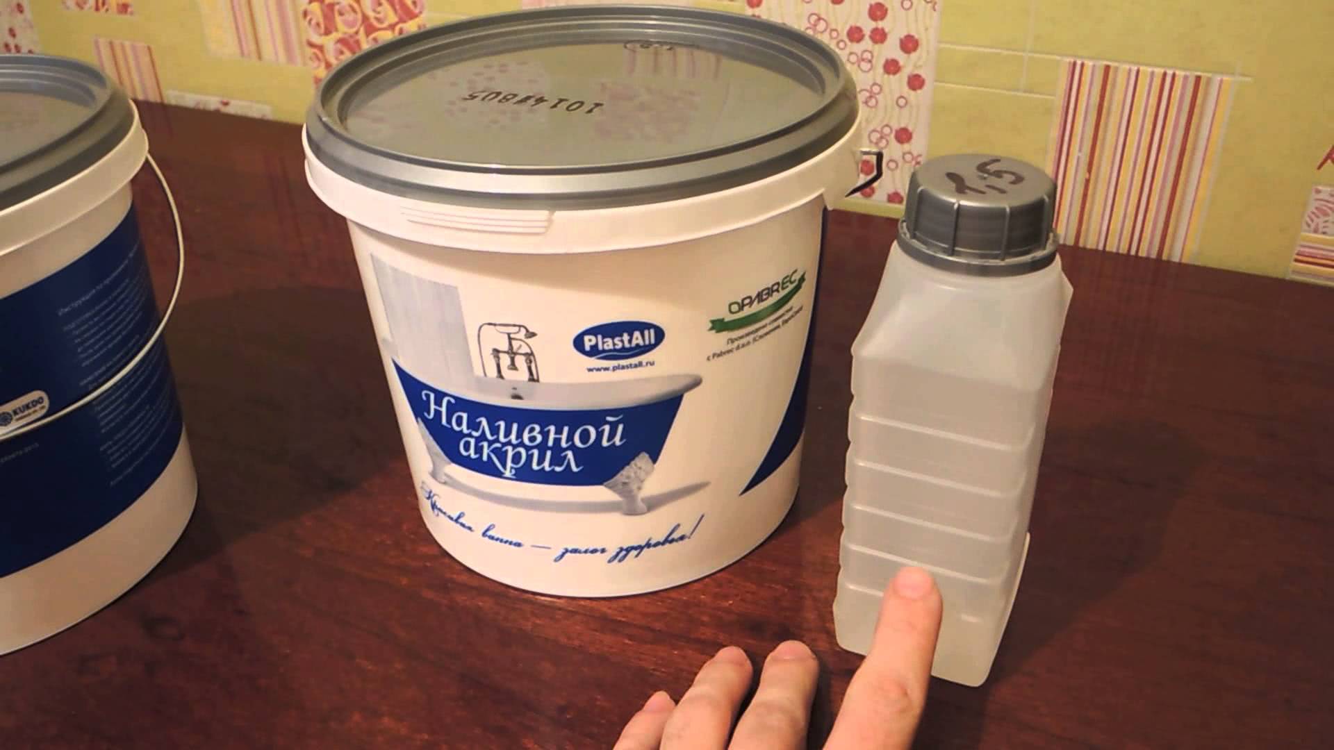 После подготовительных работ можно начинать восстановление ванны жидким акрилом. Чтобы материал не стекал на пол, нужно подложить полиэтилен или газеты (бумагу, старые обои). Нужно качественно перемешать акрил с отвердителем. На 2,7 кг акрила, 400 гр.отвердителя. Материалы соединить и на малых оборотах строительным миксером нужно тщательно смешать, придерживая емкость ногами, чтобы случайно не перевернуть. Мешать необходимо минут 10. Затем дать материалу постоять несколько минут и еще раз перемешать в течение 5 минут.