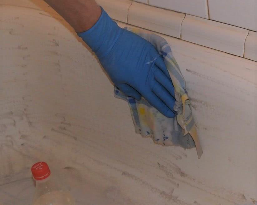 Первым этапом обновления ванны своими руками является ее чистка от старых загрязнений. Лучше всего использовать соду и наждачную бумагу. Необходимо закрыть пробку и намочить всю поверхность ванны, учитывая уголки и бортики. Нужно тщательно поскрести всю внутренность. Сода — это щелочь, которая удаляет все загрязнения и жирные пятна. Если ванна ранее была крашена, можно использовать болгарку с жесткой насадкой в виде щетки. Читку необходимо производить не менее 15 минут, чтобы сода растворила все загрязнения.