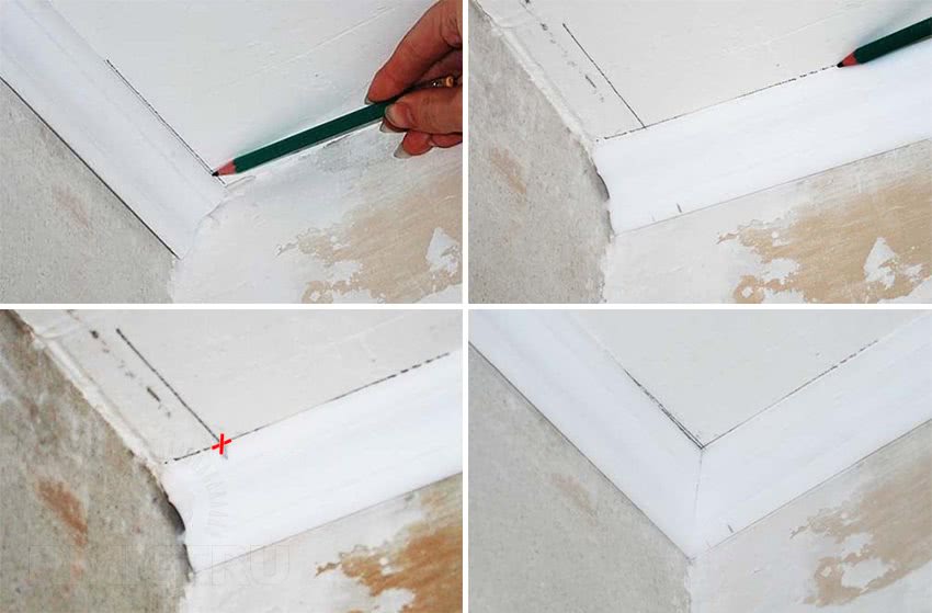 Для внешнего угла. Прикладывают плинтус справа от угла и проводят на потолке линию карандашом дальше угла соединения стен. После этого прикладывают плинтус с левой стороны от угла и проводят вторую линию до места пересечения с первой. Точку пересечения переносят на верхний край багета. Точка, в которой сходится угол стен и внутренний нижний край багета будет второй меткой. Две точки соединяют и зарезают багет по линии.