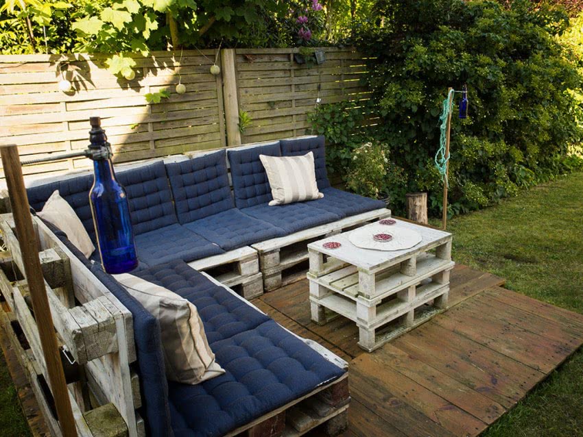 - Скамейка-диван для дачи. Ставить в углу, она имеет Г-образную или даже П-образную форму. Если конструкция стационарная, собирать по месту, крепить к стенам или другим поверхностям. Или сделать диван сборным, чтобы переносить его, если понадобится. На сиденье, спинку сшить подушки, которые привязывать лентами или тесемками.
