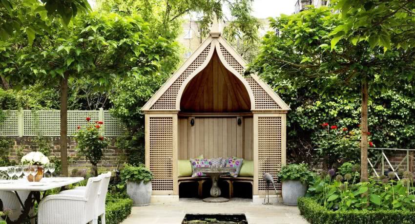 Обратите внимание на фото – беседки в саду потому и называются садовыми, что их место среди растительности (деревьев, кустов, травы):