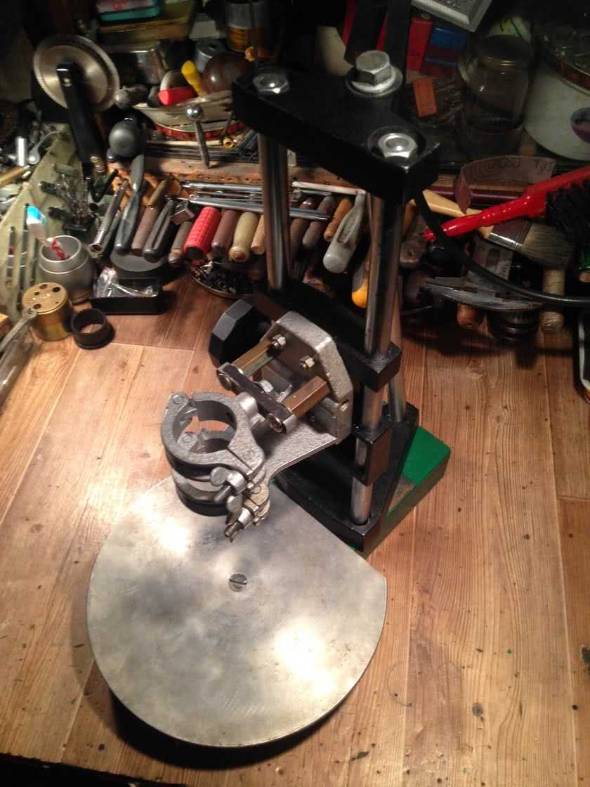 К нему привариваем круглый столик (автор использует старый пильный диск для циркулярки). Дополнительно нужно сделать фиксатор.