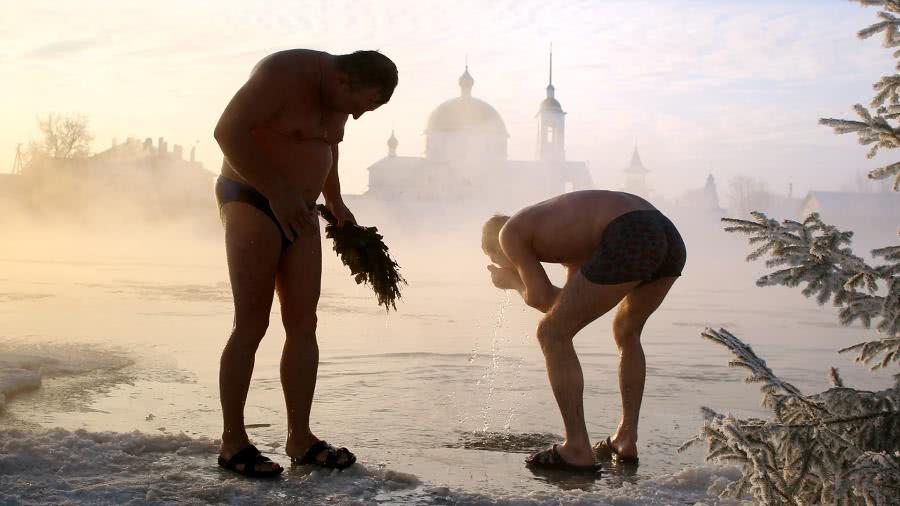 Мужчины окунаются после бани в проруби реки Великая в городе Остров Псковской области