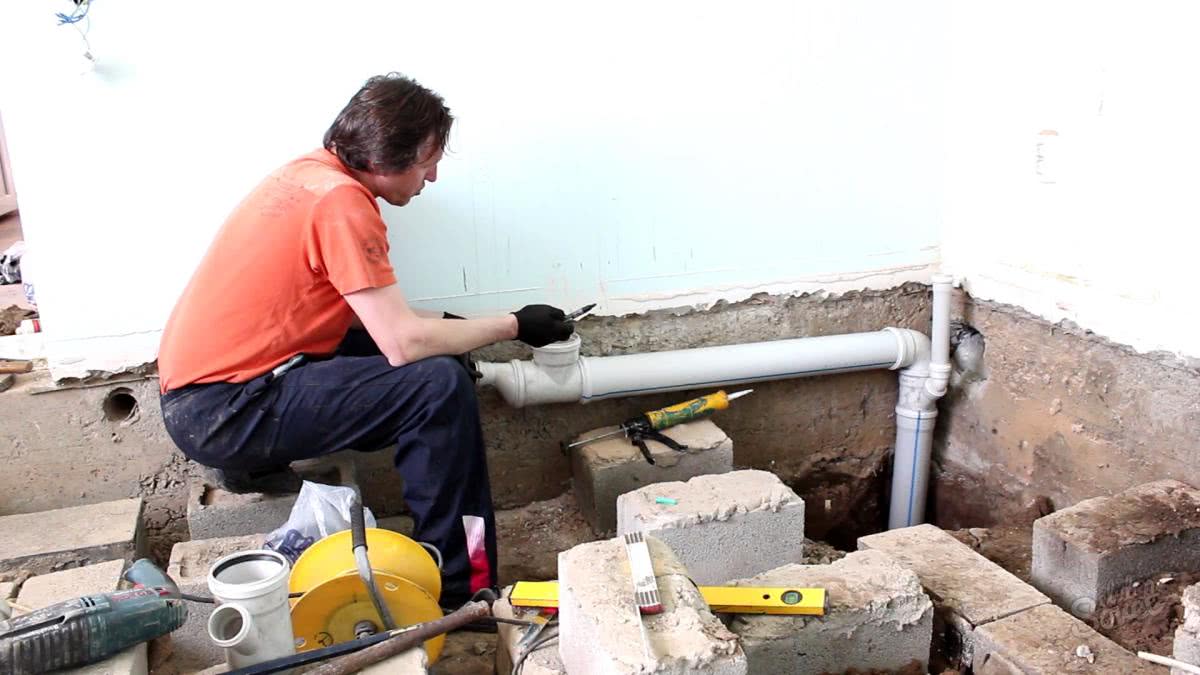 °, при диаметре 80-110 мм — 2°, это означает, что с каждым метром нижняя точка трубы должна опускаться по отношению к верхней на 2 см. Сложность данного варианта в том, что если пытаться установить его при готовом доме, без разрушений и, возможно, значительных никак не обойдется.