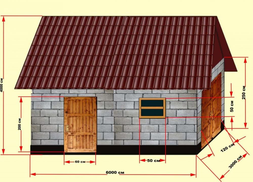 Гараж из пеноблоков для небольшой машины (мотоцикла, мопеда), предусмотрено небольшое подсобное помещение. Надежное строение хорошо защитит не только от осадков, но и от перепада температур, влажности и непрошеных гостей. Простой сарай из пеноблоков для хранения инвентаря и в кчестве мастерской также возможен.