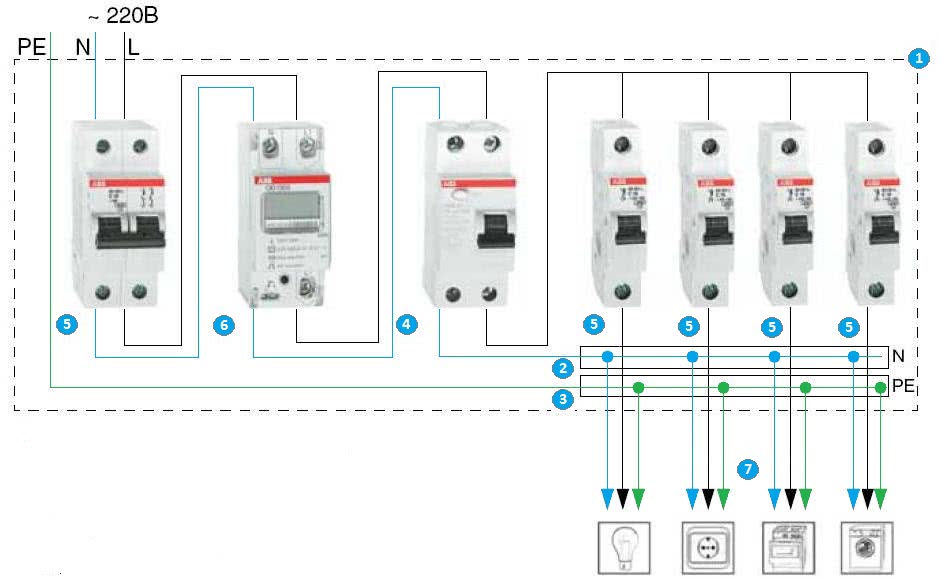 С электричеством шутки всегда заканчиваются плачевно, поэтому, вопрос безопасности должен стоять на первом месте. Существует такое устройство, как УЗО – устройство защитного отключения (фото выше №3 ), которое необходимо установить перед автоматами, которые распределяют нагрузку в квартире. Это устройство защищает линию, даже если такие утечки минимальные, что снижает к минимуму поражение электротоком. УЗО включается следующим образом: фаза подключается на входы автоматов, а нулевой провод соединяется с нулевым общим проводом. Автоматы так же имеют встроенную защиту от превышения нагрузки и от коротких замыканий.