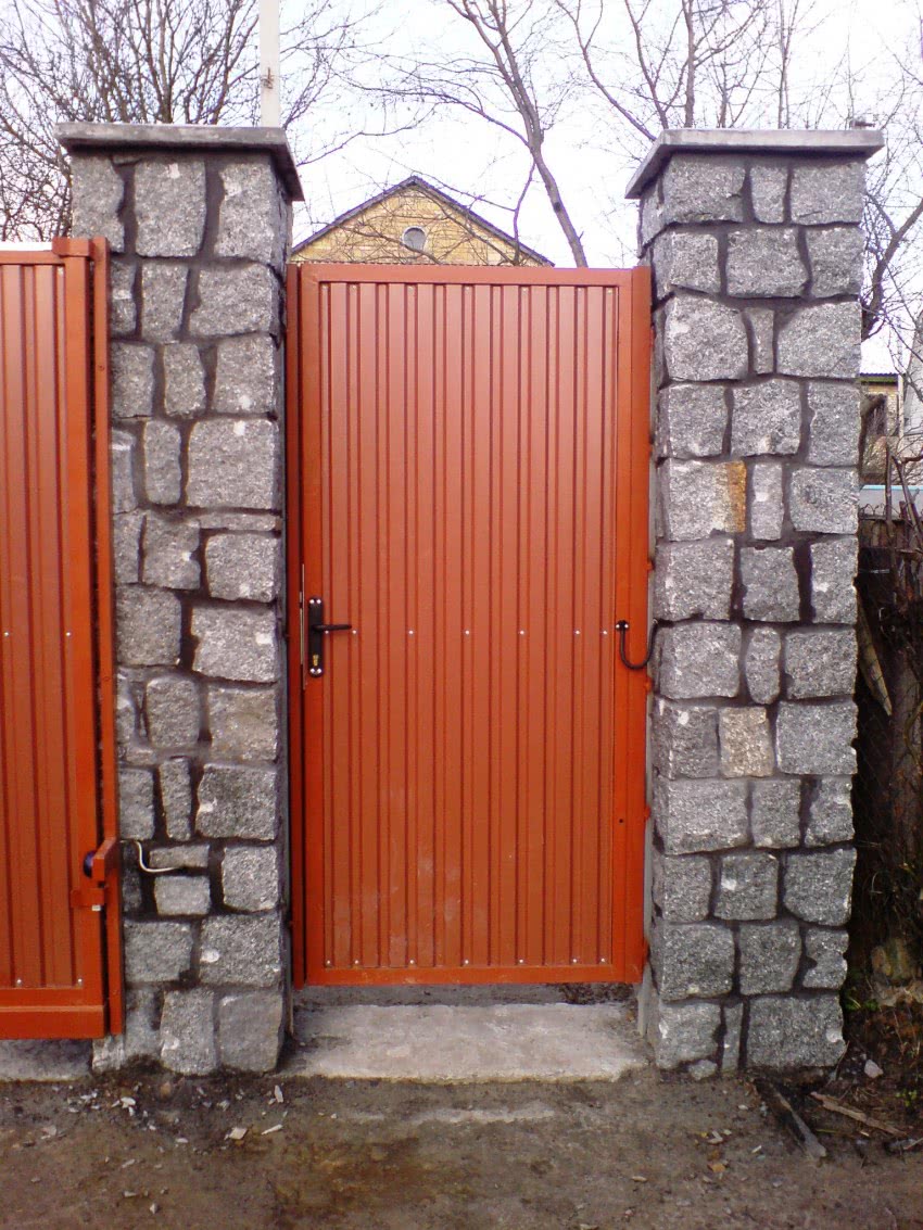 На этом этапе надо проверить вертикальность столба, чтобы не было перекоса. Это делают при помощи строительного уровня или отвеса. Выставленный столб заливают цементно-песочным раствором, который замешан в соотношении 1:3. Время застывания бетона — около трех суток. Роскошно смотрятся калитки со столбами из камня. Такие опоры даже обычному забору из профнастила добавят изюминку и красоту. Ставить их надо обязательно на фундамент и армировать металлическими прутами.
