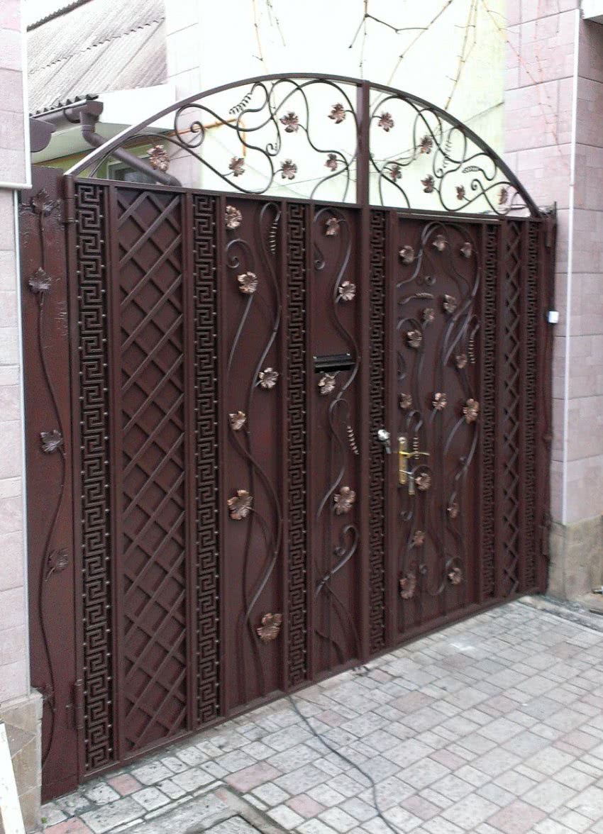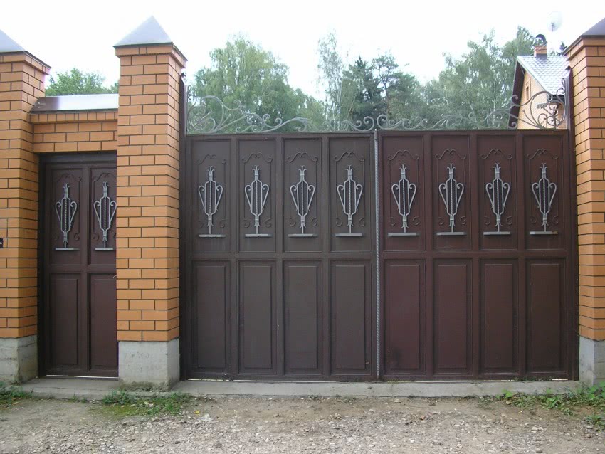 Кованые ворота и калитка с коричневым профнастилом и узором с завитками