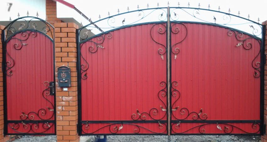Материал часто используется в качестве фона оформления конструкции воротных створок коваными элементами. Кованые ворота из профлиста отлично сочетаются с аналогичным забором.