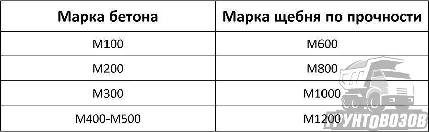 Соответствие марок щебня и бетона