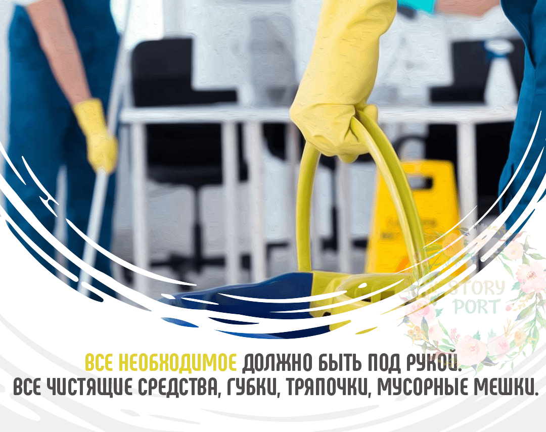 - Все необходимое должно быть под рукой. Все чистящие средства, губки, тряпочки, мусорные мешки.