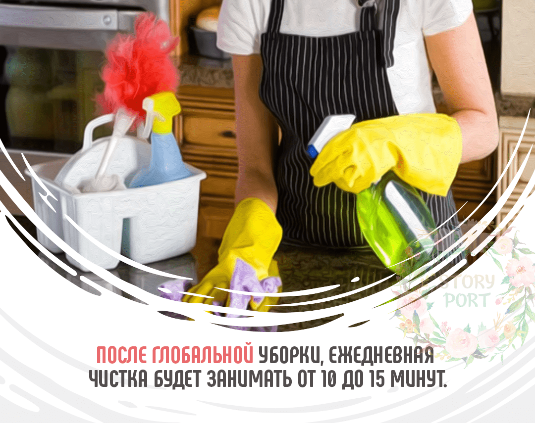 - Специальное время для уборки не выделяется, обычно уборка делается в «фоновом» режиме, между делом. Требуется не более получаса в день для поддержания порядка.