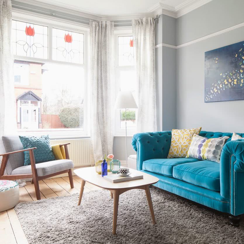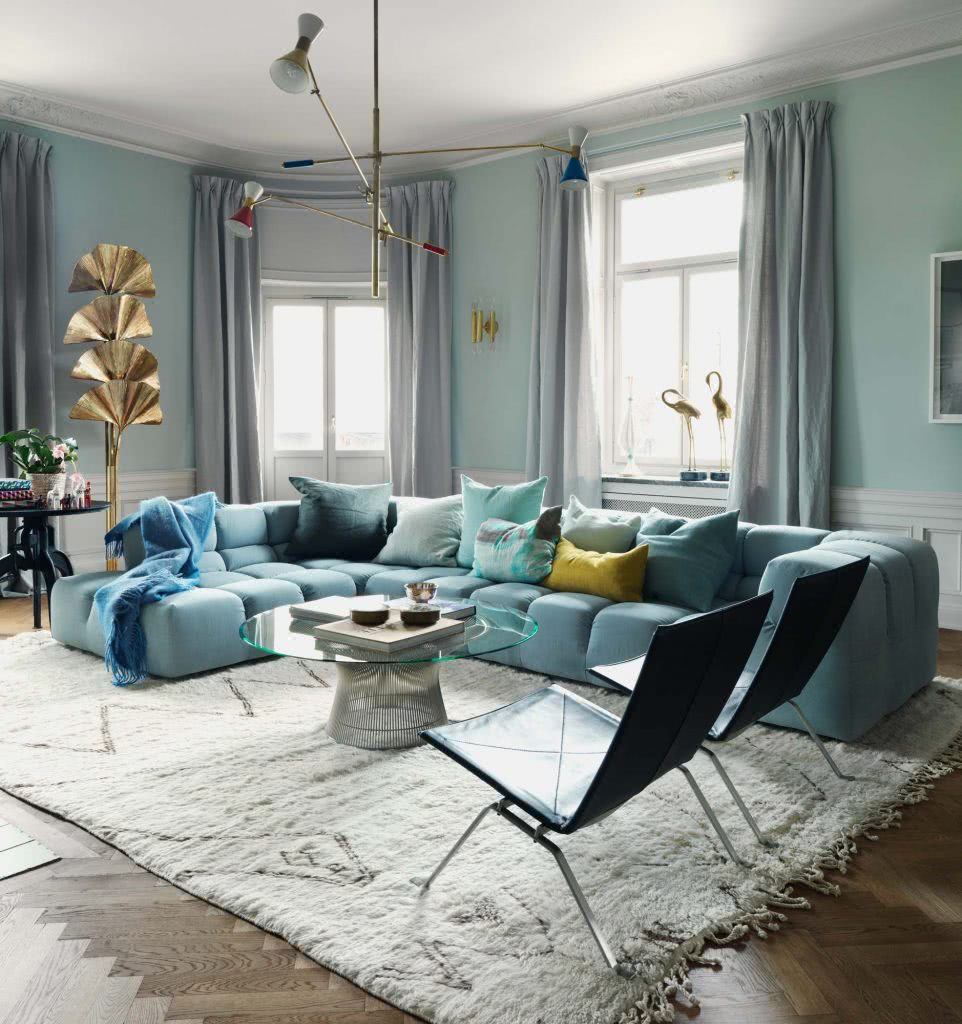 По сравнению с оранжевым или красным, голубой цвет в гостиной — безопасное решение. Это пастельный и расслабляющий цвет, напоминающий голубое небо или море. Цвет успокаивает, но в то же время привносит в интерьер свежесть и немного летнего, теплого климата. Он не бросается в глаза, поэтому с голубым вы можете экспериментировать, сочетая с другими подходящими цветами, не боясь переборщить.