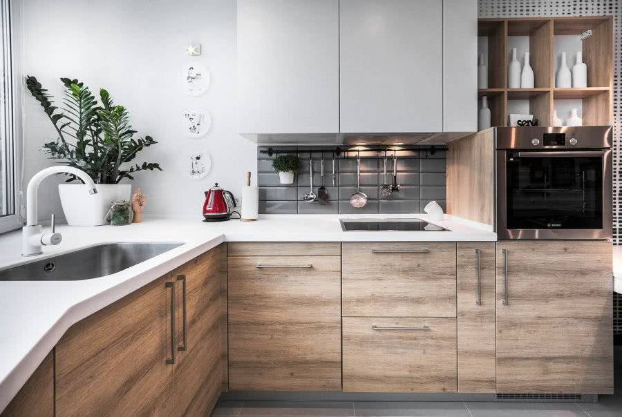 Выделяющийся плиточный фартук в белоснежной кухне.