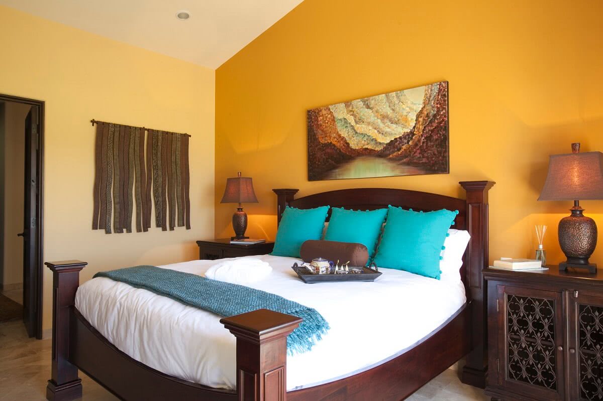 Подушки цвета «морозное небо» — яркий холодный акцент на фоне теплых тонов в спальне в африканском стиле