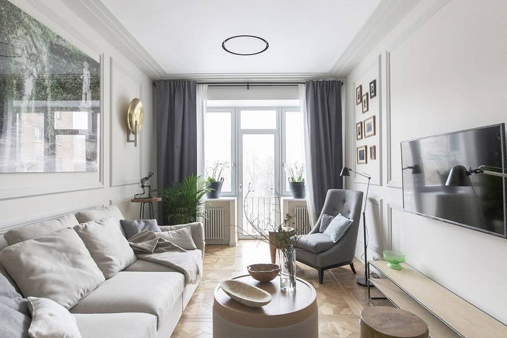 В маленькой гостиной серому цвету лучше выделить акцентную роль