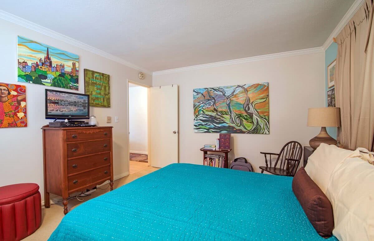 Сочно-бирюзовое декорирование как основной яркий акцент в классической белой спальне