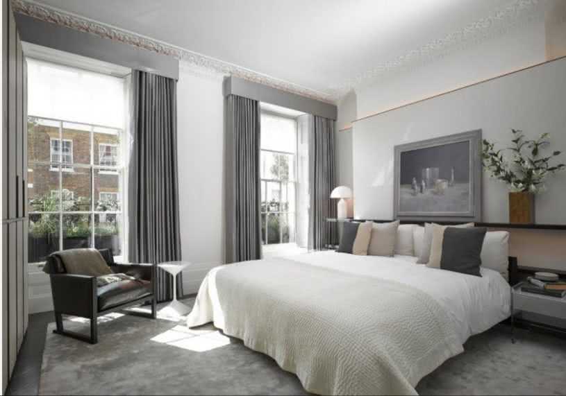 Светлый тон разбавляет унылость серых элементов, делает интерьер утонченным. В помещении используют разнообразные белые оттенки. Серый интерьер спальни понравится многим, он создаст гармоничную обстановку. Не нужно приобретать массивные предметы мебели для таких апартаментов, лучше купить легкие конструкции.