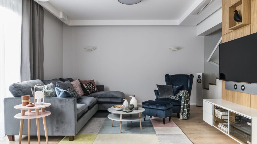 Атмосферу безмятежности придаст дизайну гостиной декор в светлых серых тонах. Если этот тип цветового исполнения слишком скучен и консервативен, вы можете добавить яркие детали — мебель и аксессуары.