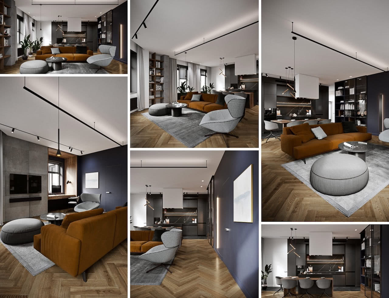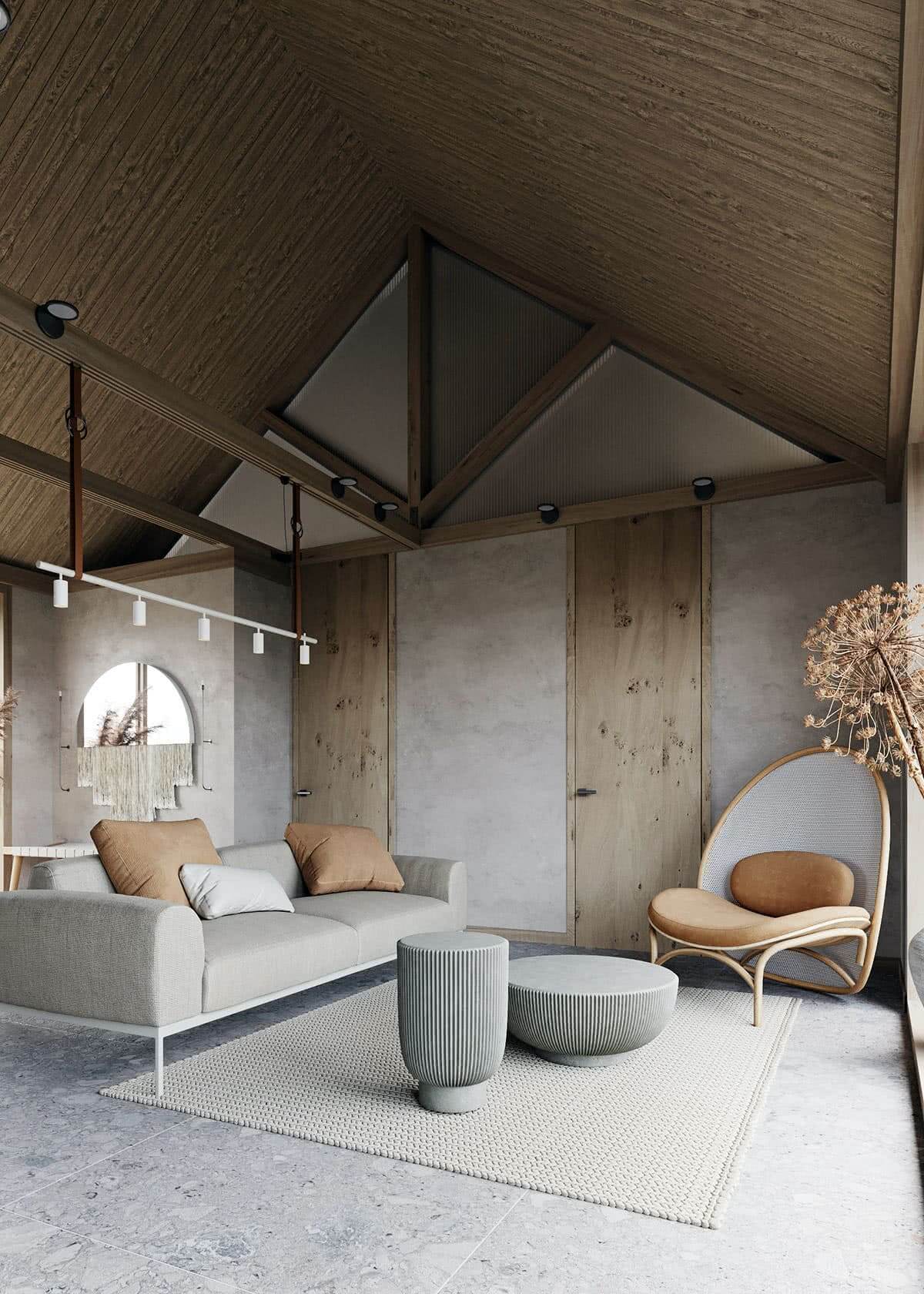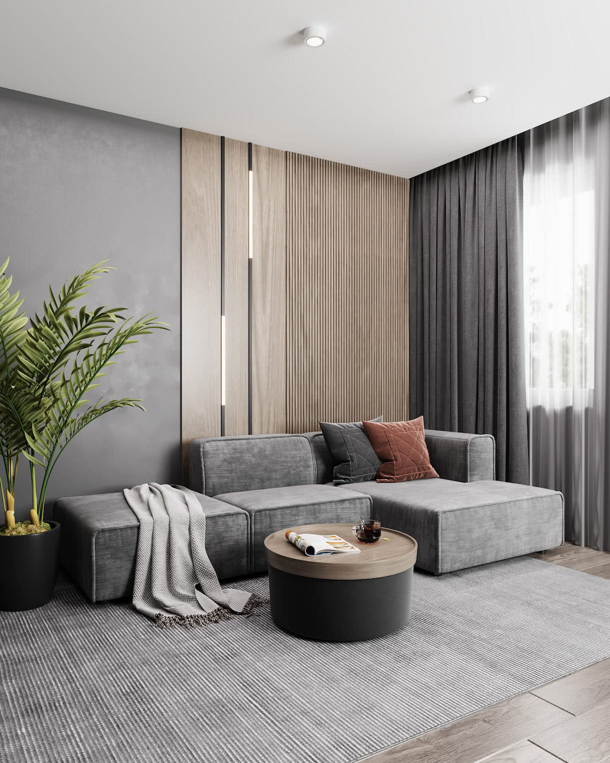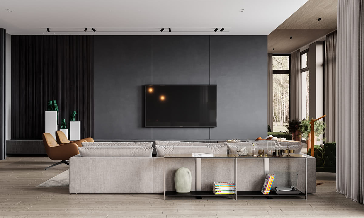 Современная и минималистичная серая гостиная