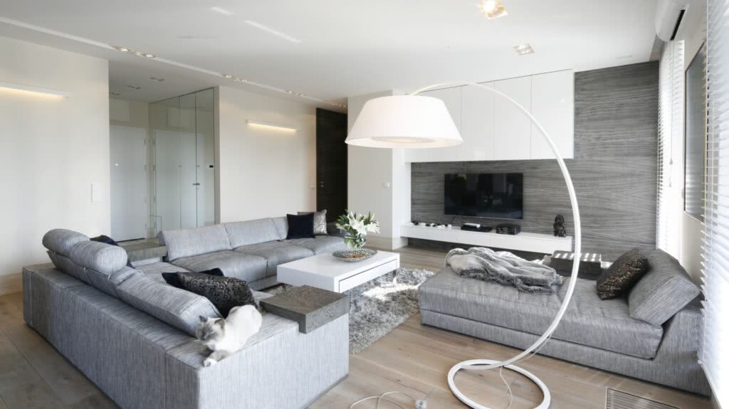 Серая гостиная в стиле минимализма — это прежде всего характерный пол. В этом случае вы можете выбрать плитку или уже упомянутый архитектурный бетон.