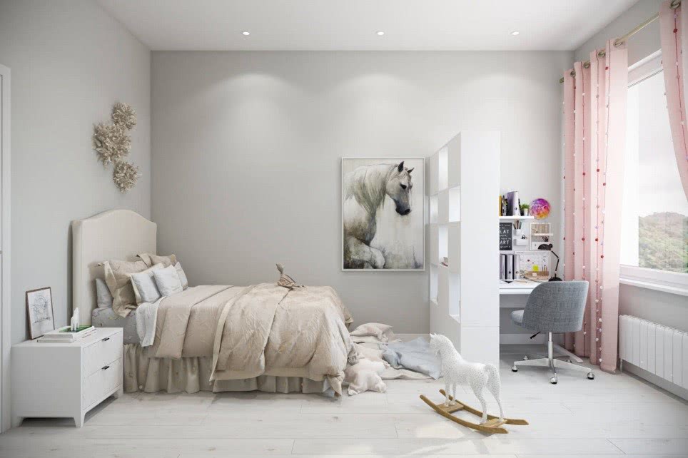 Будет хорошо смотреться с светло-серыми стенами, розовым или нежно-голубым текстилем, белой дверью. Мебель нужно подбирать светлее или темнее стен, чтобы она не сливалась в один серый тон.