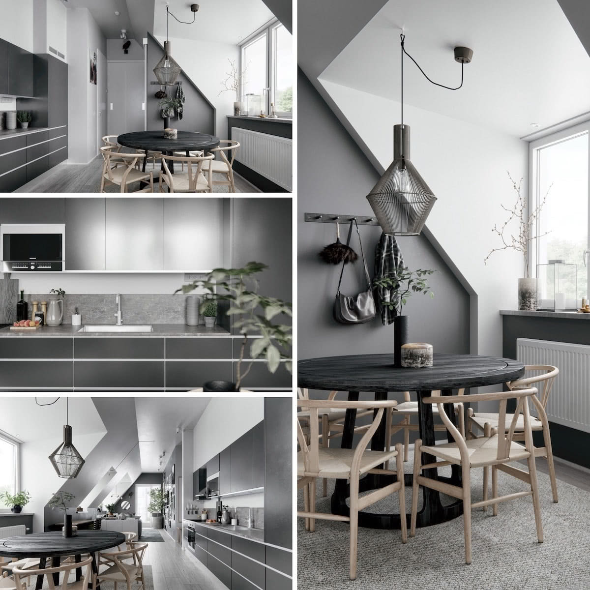 Серый потолок, белые стены и черные оттенки в интерьере