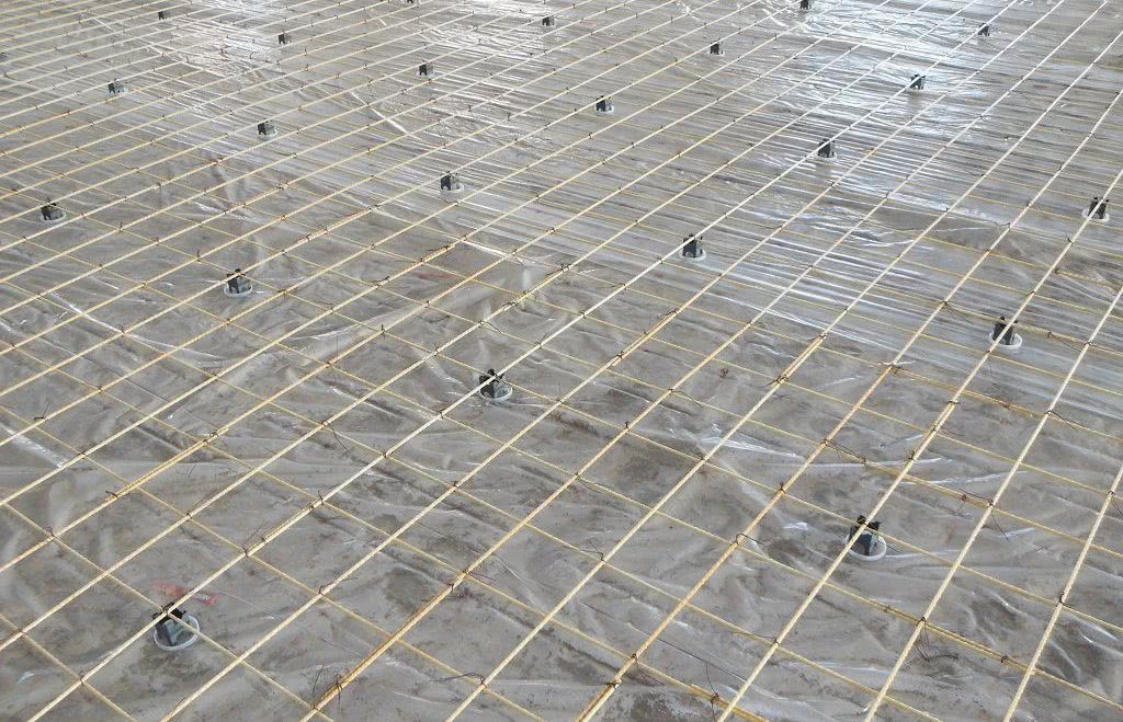- Раскладка пластиковых фиксаторов ближе к подошве плиты или выполнение подкладки из раствора, чтобы арматура заняла правильное положение в слое бетона. Если арматура не сваривается или не вяжется, то укладывается на фиксаторах-стульчиках.