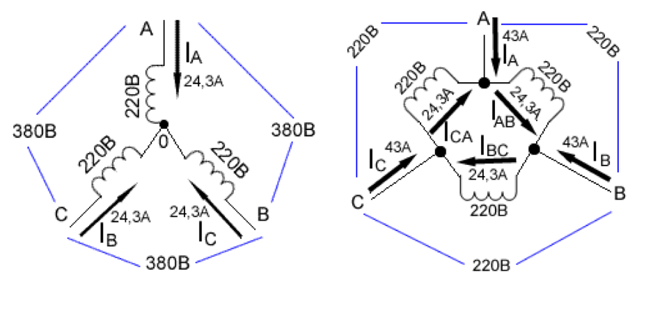 Если присутствует «А», это свидетельствует о том, что использоваться может как схема «треугольник», так и «звезда». «Б» сообщает о том, что подключены обмотки «звездой» и не могут быть соединены по – другому.
