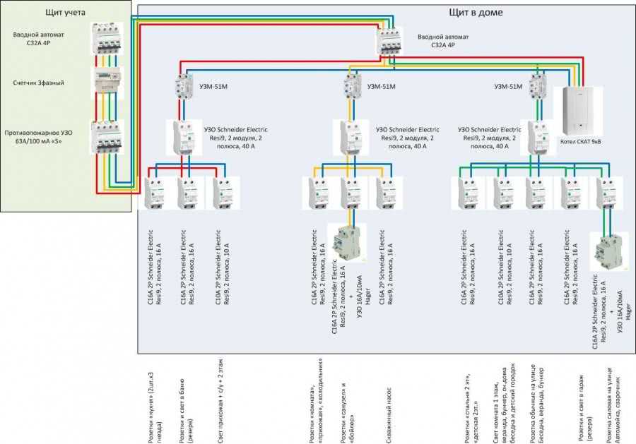 Не всегда схемы электропитания просты: групп потребителей разбивают по этажам, отдельно выводят хозпостройки, освещение гаража, подвала, двора и придомовой территории. При большом количестве потребителей кроме общего УЗО после счетчика, ставят такие же устройства, только меньшей мощности — на каждую группу. Отдельно, с обязательной установкой персонального защитного устройства, выводят электропитание для ванной комнаты: это одно из самых опасных помещений в доме и квартире.