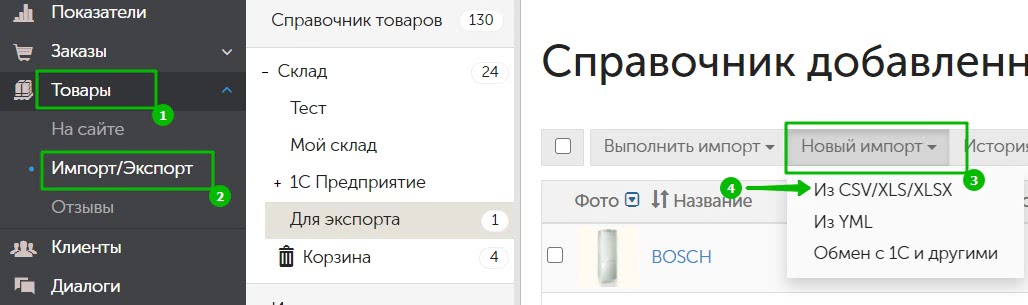Для выгрузки товаров перейдите в раздел Товары → Импорт/Экспорт, нажмите на шестеренку около нужной категории и нажмите «Выгрузить в CSV»: