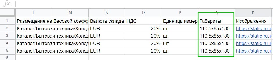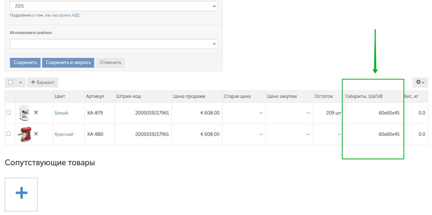 4. После загрузки габариты будут заполнены в соответствующем варианте товара.
