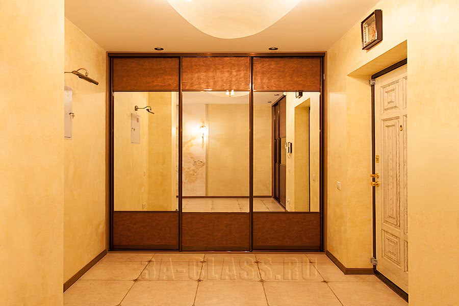 В интерьере прихожей шкаф-купе занимает центральное место, поэтому привлекательный стильный внешний вид мебели всегда в приоритете. Для декорирования фасадов используются всевозможные техники и материалы:
