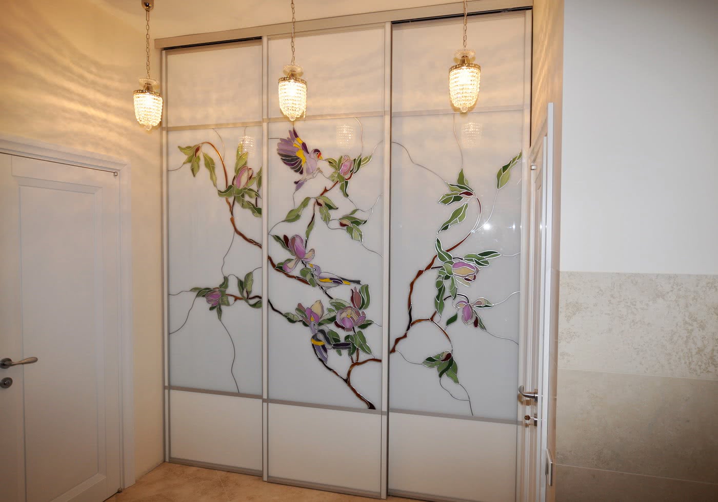 В интерьере прихожей шкаф-купе занимает центральное место, поэтому привлекательный стильный внешний вид мебели всегда в приоритете. Для декорирования фасадов используются всевозможные техники и материалы: