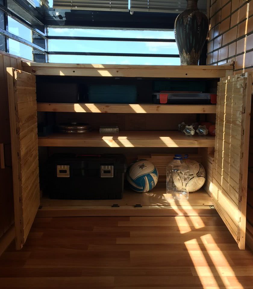 Для абсолютно любого балкона подойдет встраиваемый шкаф. Такой вариант можно заказать или изготовить своими руками. Главное, не ошибиться в мерках и параметрах.
