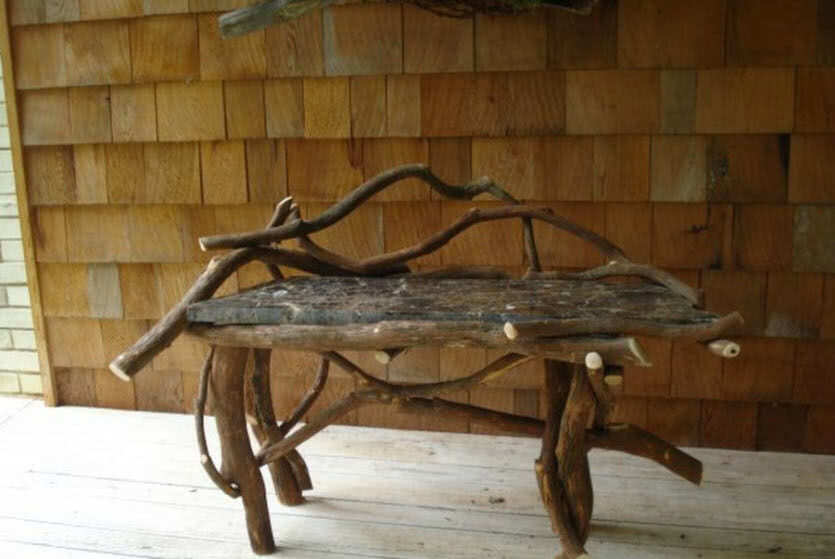 Если имеется большой опыт работы с деревом, можно соорудить комплект мебели. Он состоит из стола и двух лавочек. Каждый предмет собирается отдельно, а затем элементы соединяются в одно изделие при помощи брусков по два с каждой стороны. Столешницу закрепляют на крестообразных ножках. Чтобы конструкция приобрела устойчивость, первыми фиксируют скамейки, а потом точно посредине — стол. И вот, вы уже владелец удобного уголка для общей трапезы на свежем воздухе.