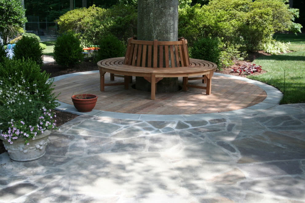 Поэтично и романтично смотрится круговая скамейка вокруг большого дерева, словно окунаешься в чей-то исторический роман.