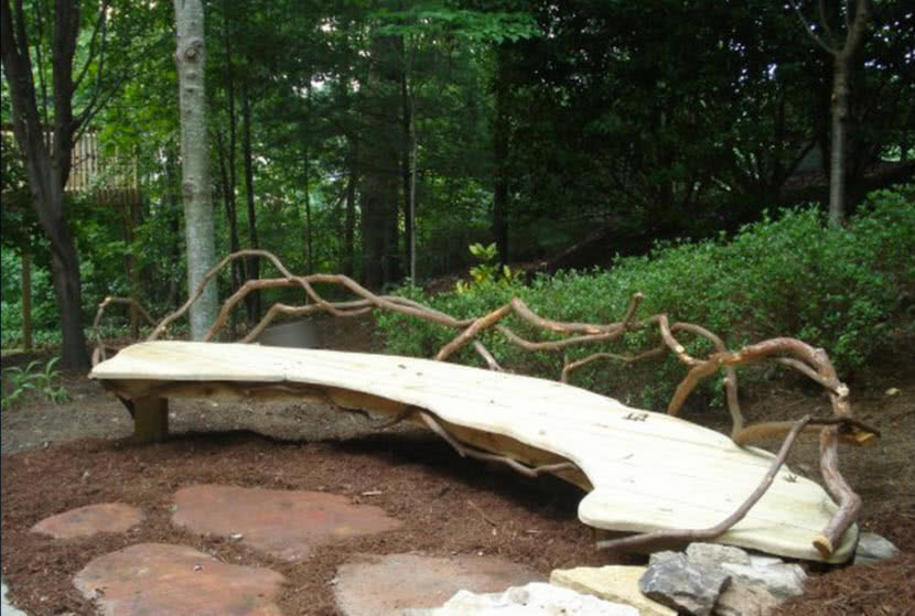 А вот пример очень красивой и оригинальной скамейки, в которой нет ни одного гвоздя или самореза.