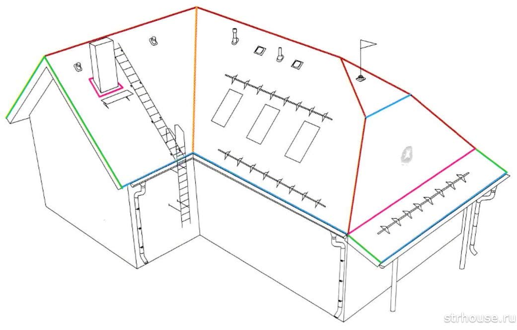 Располагают их не только по периметру кровли, но и над мансардными окнами, дымоходами и другими выступающими частями крыши.