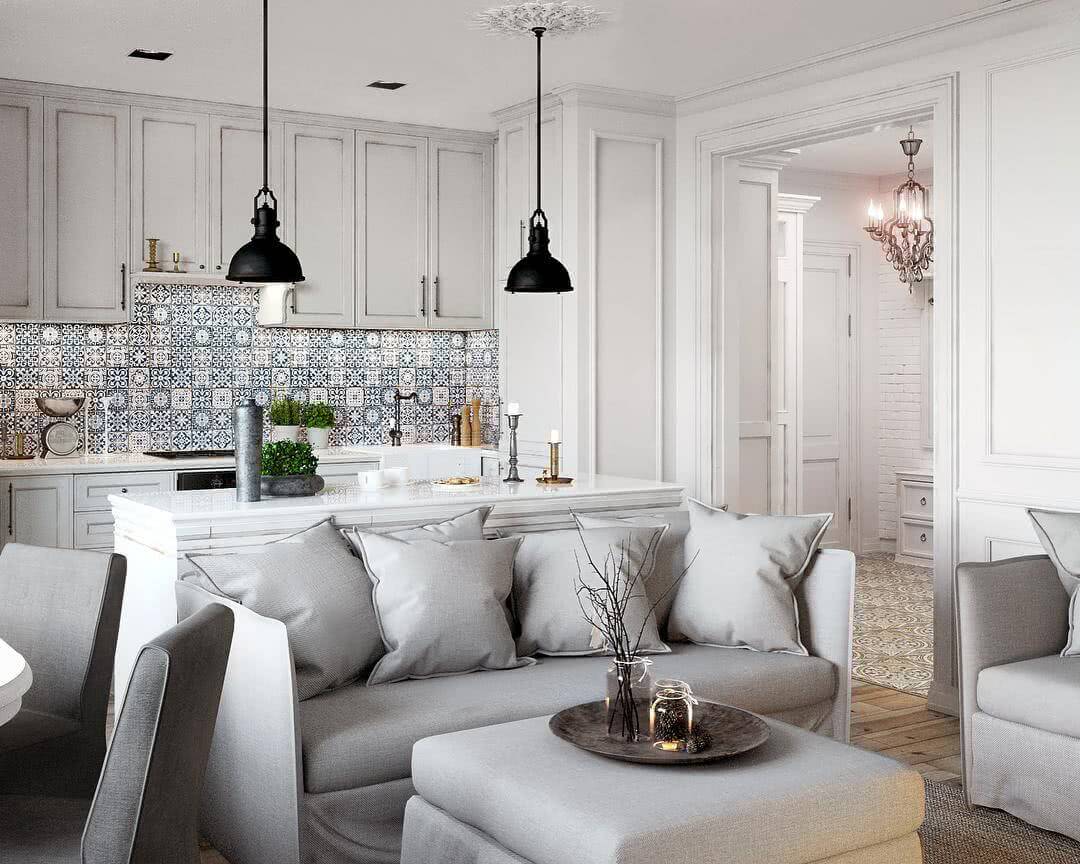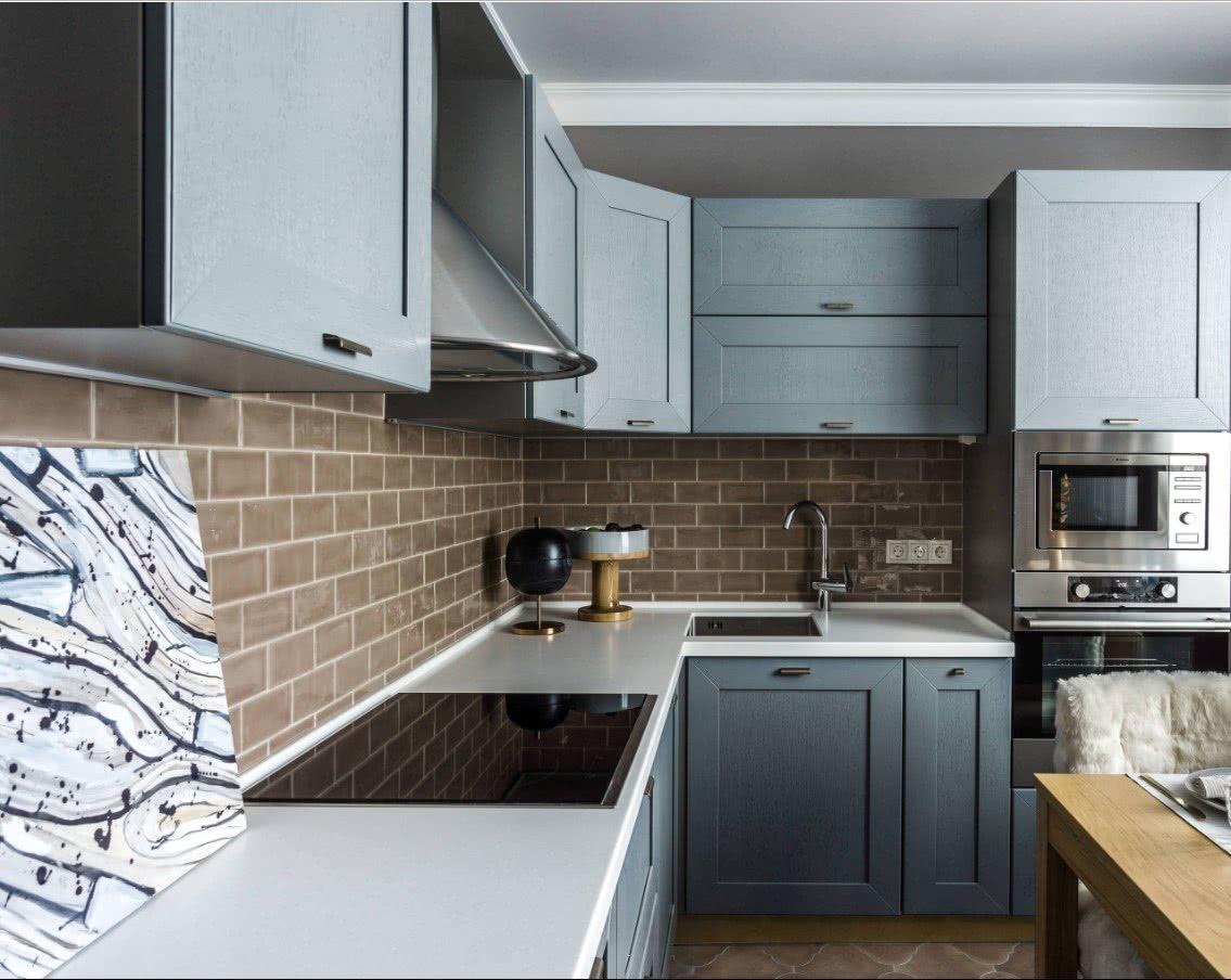Выделяющийся плиточный фартук в белоснежной кухне.