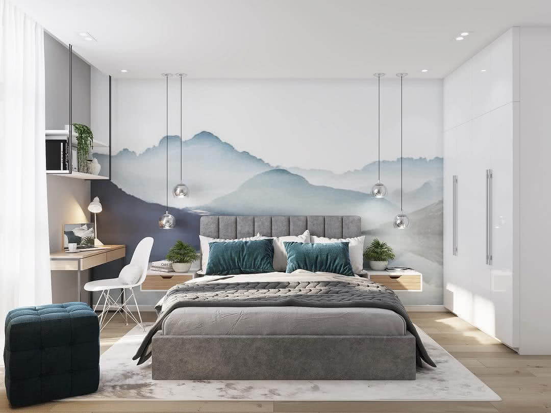 Уютная скандинавская спальня с видом на горы.